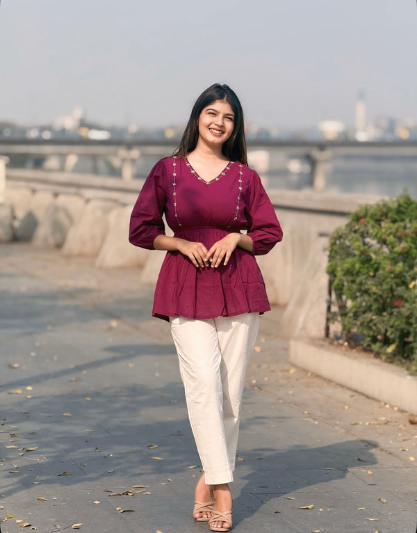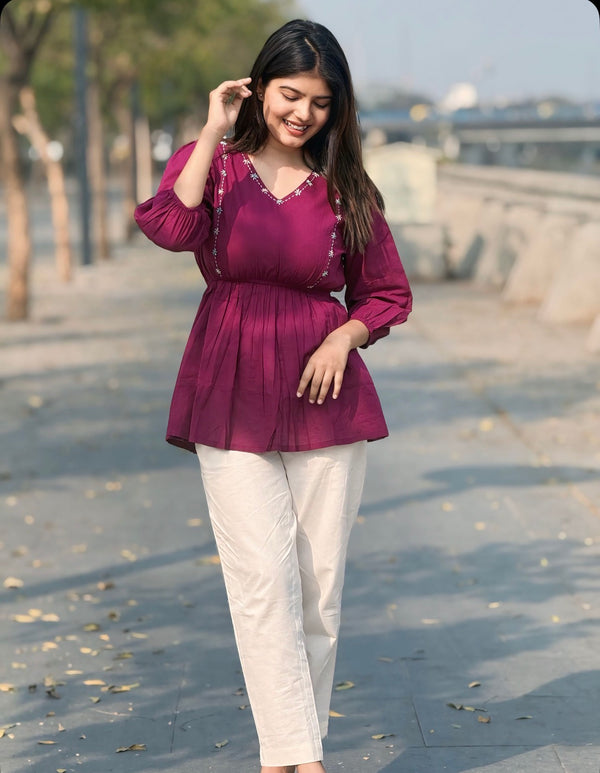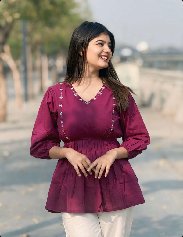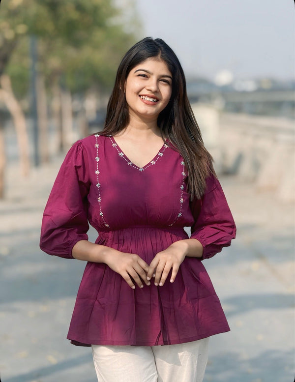 ANORA Dusty Plum Hand Detail Cotton Top