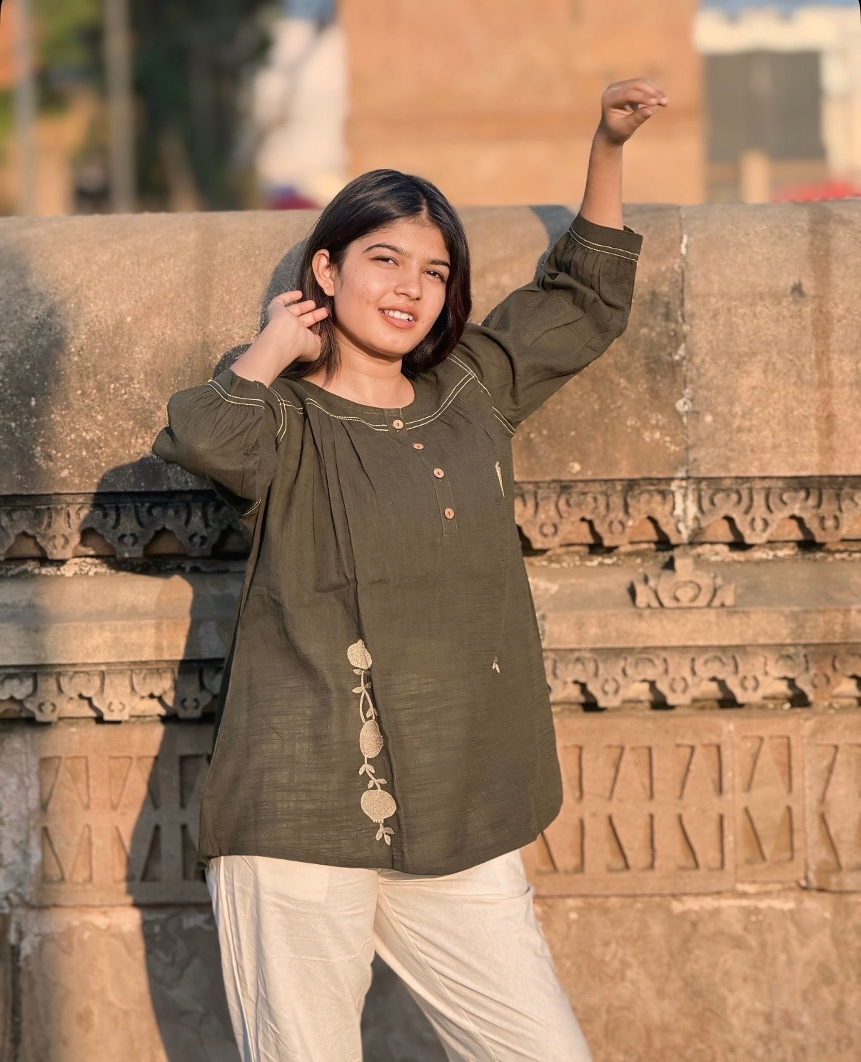 ANORA Army Green Hand Detail Cotton Top