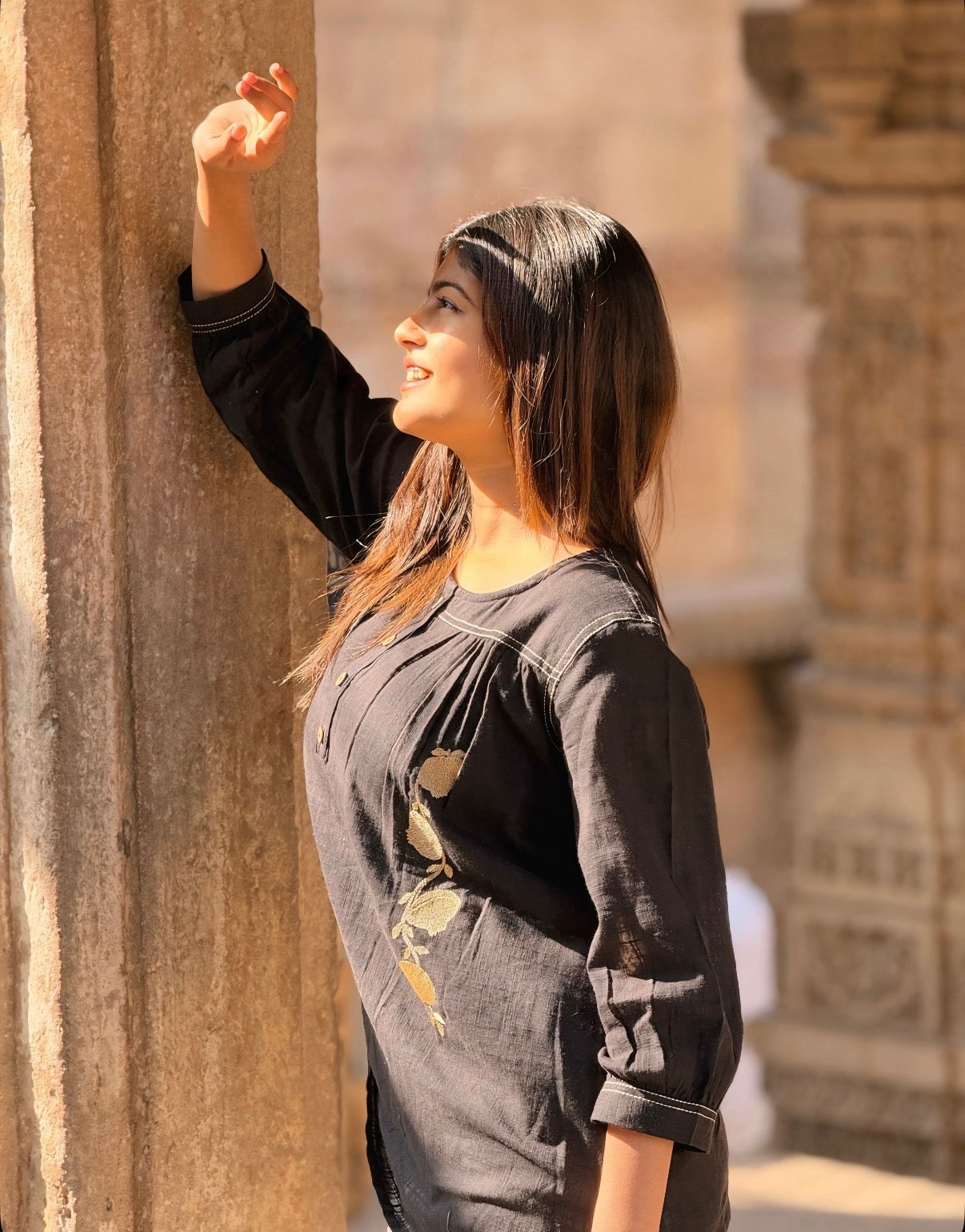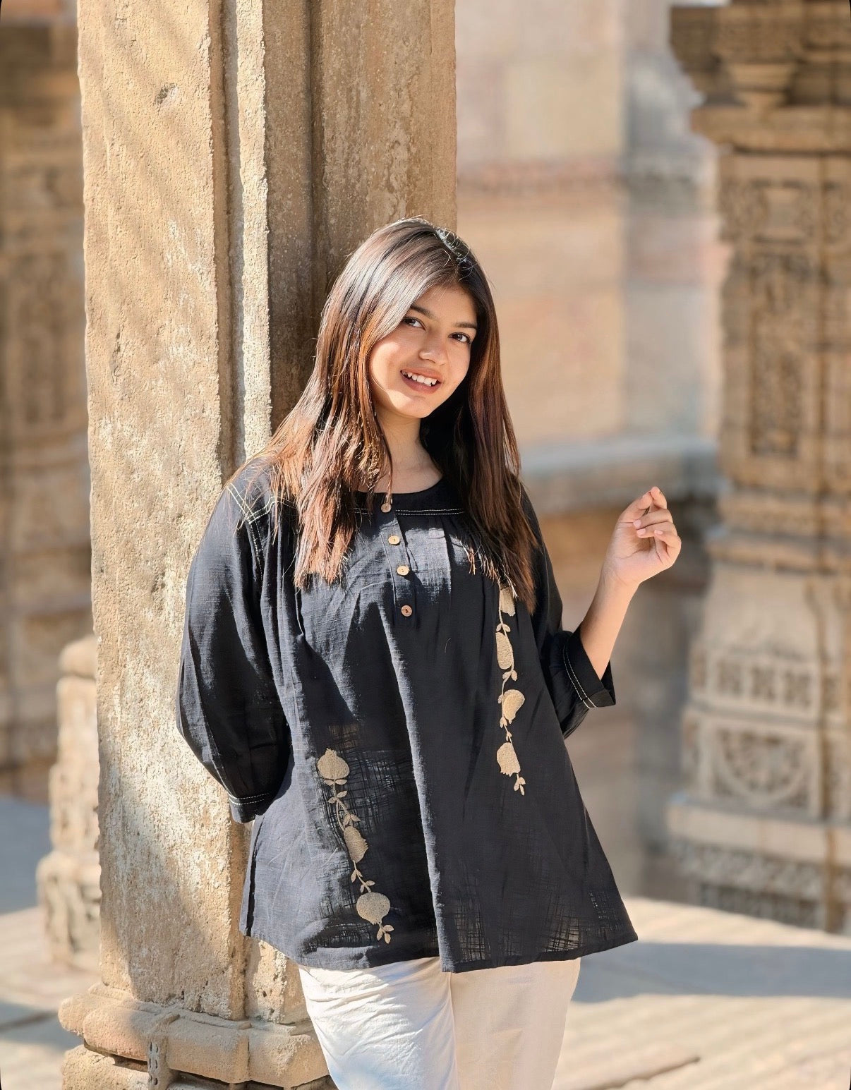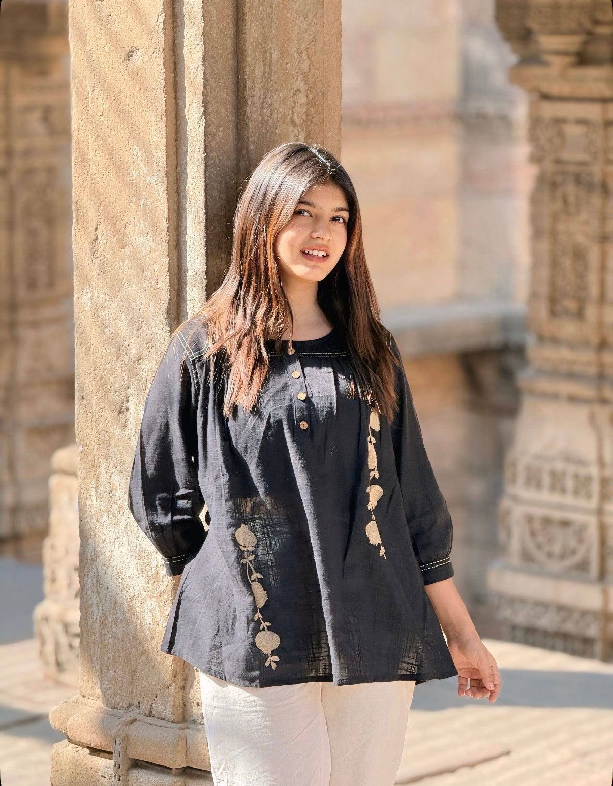 - Sleeves: 3/4th sleeves with contrast stitch detailing on cuffs