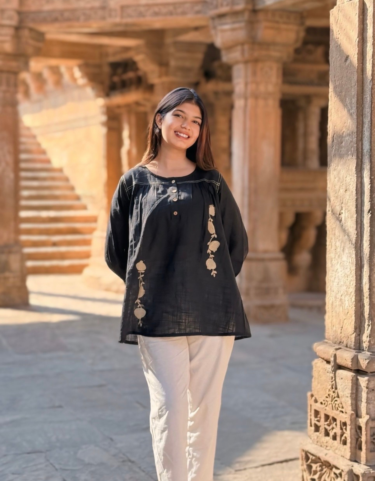 - Neckline: Round neck with wooden button placket
